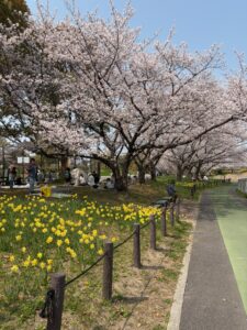 近くの細口池公園は、桜も水仙も満開です。