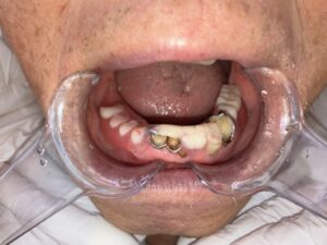 また、高齢の方の中には、歯茎が弱ってくるだけでなく、外側から歯を支えている唇に力が無くなってきて、歯が前に傾いてくることがあります。もともと奥歯は、歯列を前に押してくる傾向にあって、傾いてきた前歯を押し出してしまうこともあります。