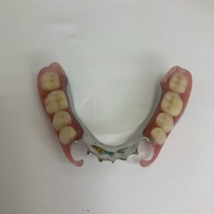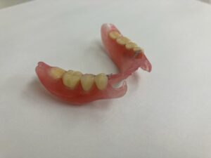 前に出ているツメ(引っ掛かり)が歯茎と同じピンク色なのがお分かりいただけますね。お口にハメると、入れ歯が入っていることに全く気づかれない様子になります。
